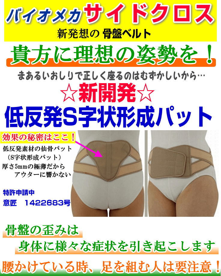 ◎「バイオメカサイドクロス」は、新開発の低反発を使用したS字状形成パットの骨盤サポーターです。 骨盤の形はとても大切で、骨盤が歪む事によりさまざまな症状が現れます。 これを装着することにより、股関節の位置を補正して姿勢を正しくしてくれます。