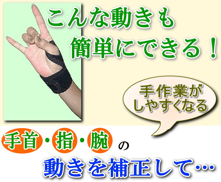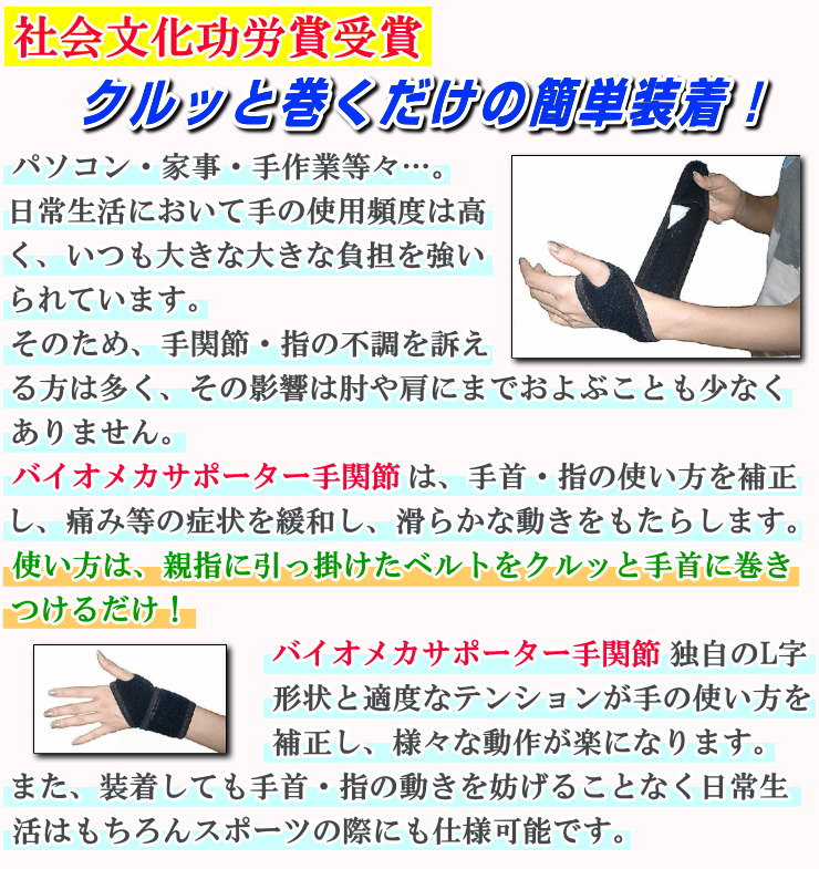 ◎「バイオメカサポーター 手関節(愛知式)」は、装着することで手首・指の使い方を補正し、手首・指の症状を緩和し、滑らかな動きをもたらします。