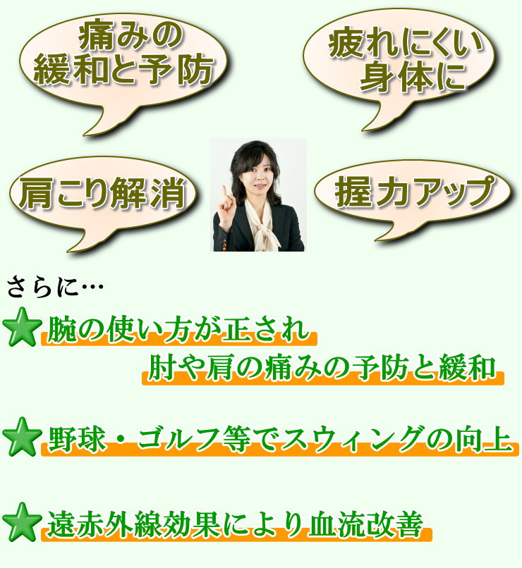 ◎手首・指を酷使するパソコン作業にもお薦めです。 また、テニス・ゴルフなどスポーツにも適しています。